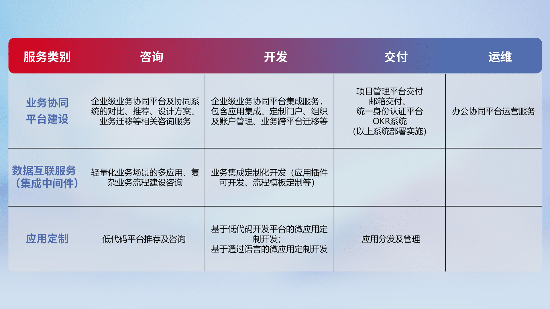 针对钉钉、、、企微、、、、IDaas等平台级产品提供产品的规划、、、方案、、、、交付、、、、定制化开发等服务,,,实现如统一协同办公、、、智能客户服务、、混合会议管理、、、、智能数据查询、、等业务场景,,实现数字化转型。。。